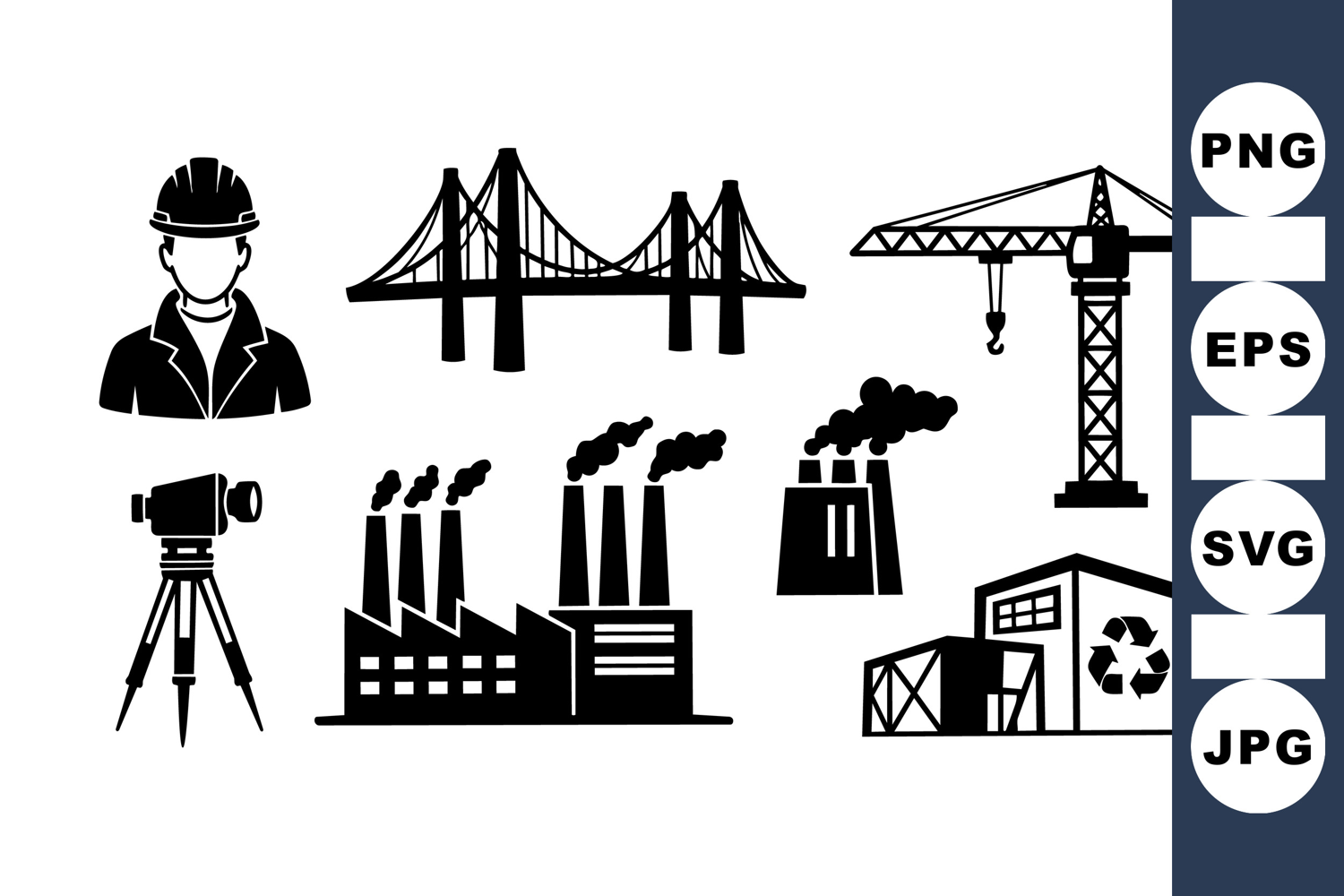 Collection of black silhouette vector icons showcasing construction worker, engineering survey tripod, suspension bridge, crane, factories emitting smoke, and recycling warehouse, conveying industrial environment and engineering concepts in a minimalist style.