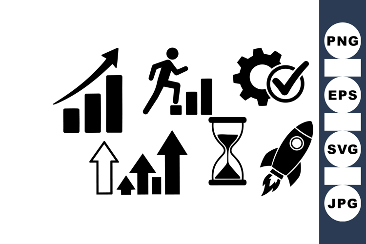 Series of black silhouette icons illustrating business growth concepts with charts, progress, time management, and innovation elements in minimalist style for digital and print use.