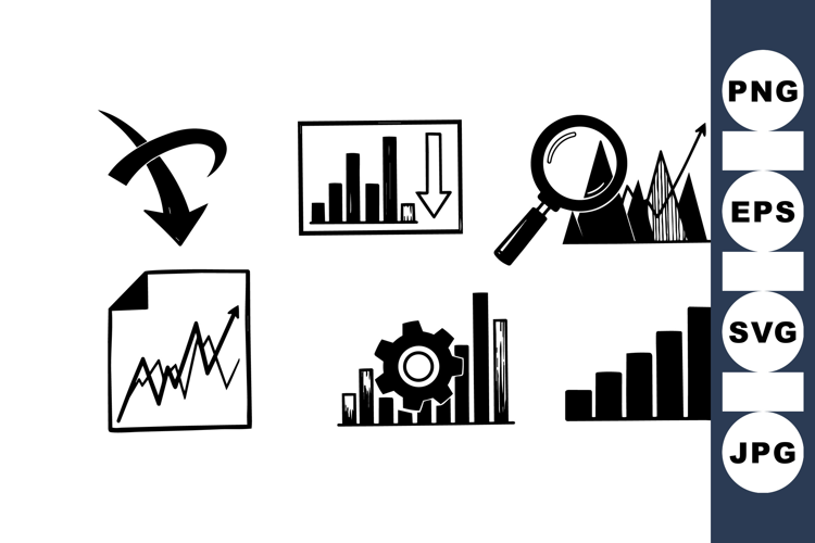 A of six hand drawn black and white business charts including bar graphs, line graphs, downward arrow, magnifying glass, and gear icons representing data analysis and performance tracking in a minimal style.