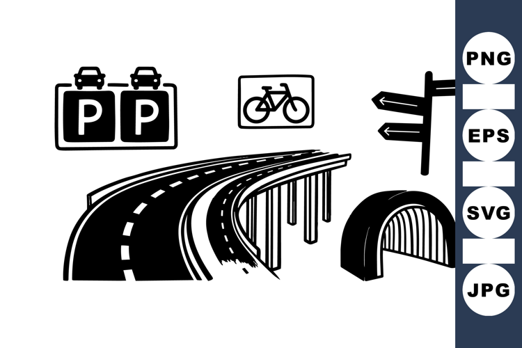 Minimalist black and white vector composition depicting a curved elevated highway alongside parking and bicycle signs, a tunnel, and directional arrows, illustrating transportation infrastructure in a clean style.