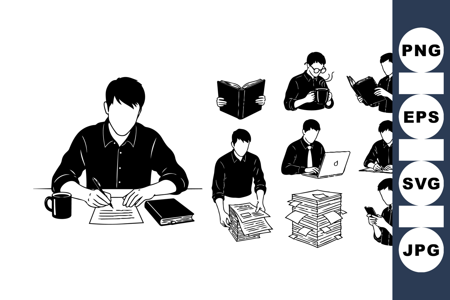 Business Man Clipart Stack Of Papers Working At Desk Coffee Break Illustration Office Worker Silhouette Man Reading Vector Man Writing Clipart Laptop User Graphic Phone Use Silhouette Professional Male Vector