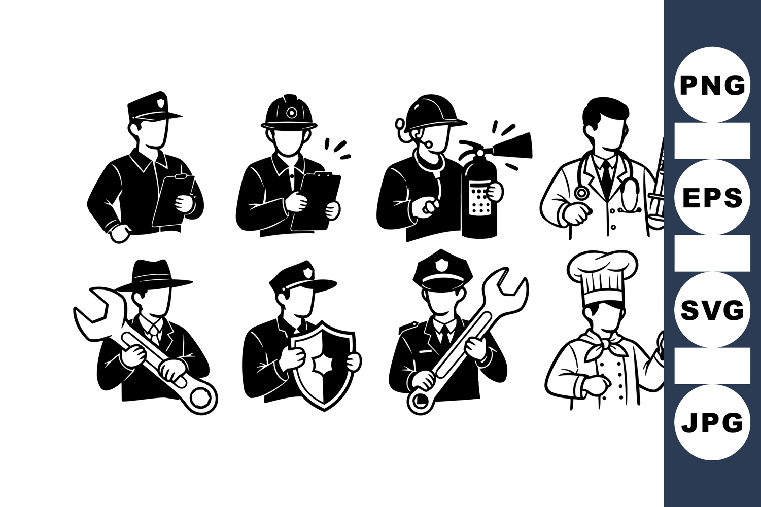 Professional Worker Icons Emergency Responder Design Medical Worker Graphic Police Officer Vector Firefighter Silhouette Image Chef Character Illustration Mechanic Tool Icon Workforce Occupation Image Industrial Worker Graphic Occupational Safety Design