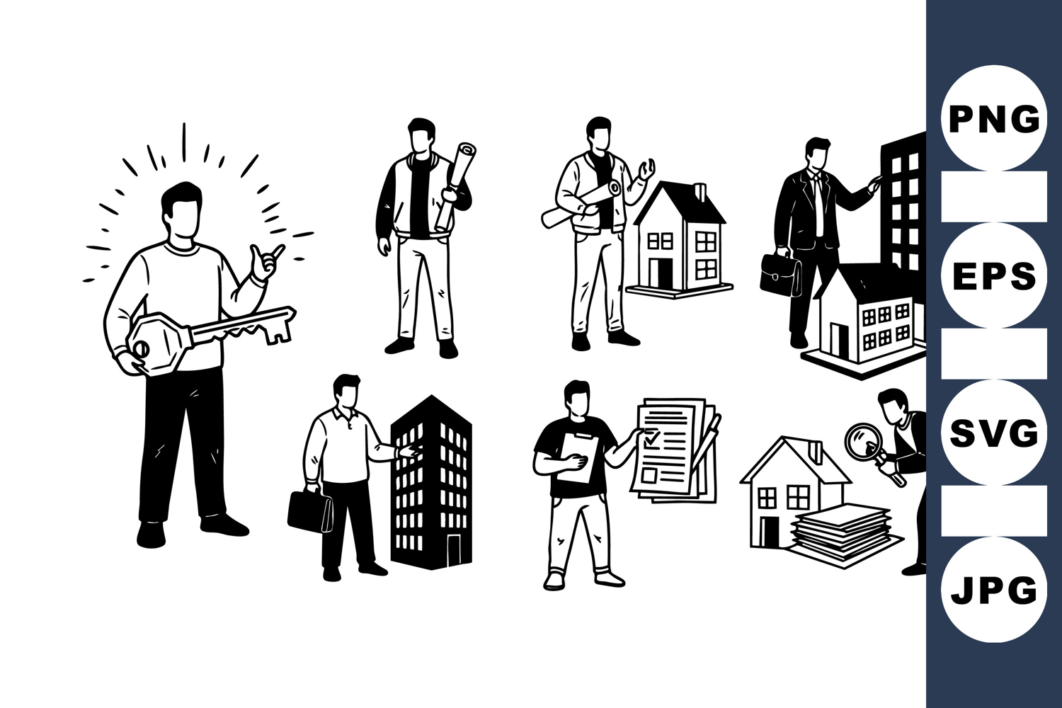 Minimalist black and white vector illustrations show a businessman holding a large key and inspecting property documents, blueprints, and buildings in various poses for real estate business and legal contexts.