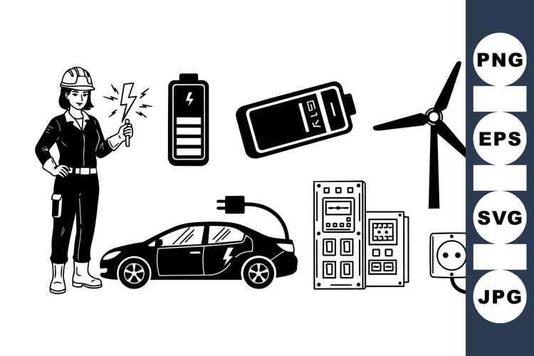 A monochrome vector shows a female engineer holding a lightning bolt next to an electric car charging with batteries, control panels, and a wind turbine illustrating renewable energy themes and technology.