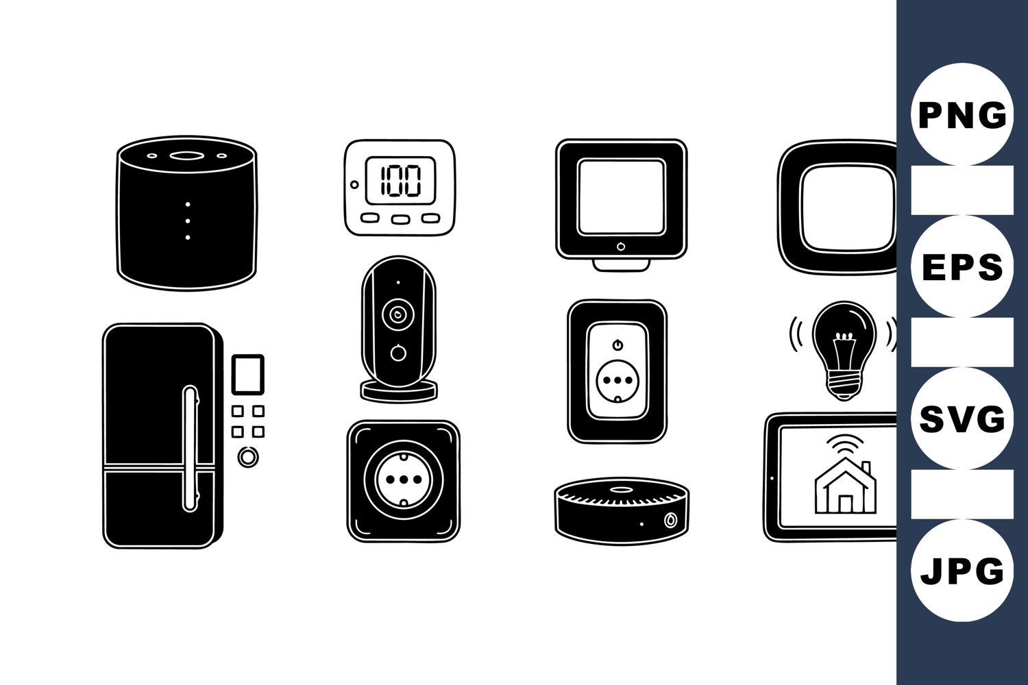 A collection of black and white smart home technology icons featuring devices like thermostat, security camera, smart plugs, and light bulb in simple vector design for digital use