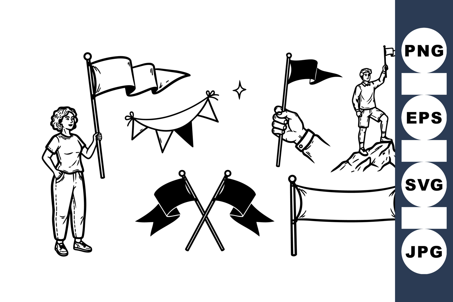 Black and white line art vector featuring a woman with a flag, a man triumphant on a mountain with a flag, flag banners, and hands holding flags, illustrating achievement and celebration themes.