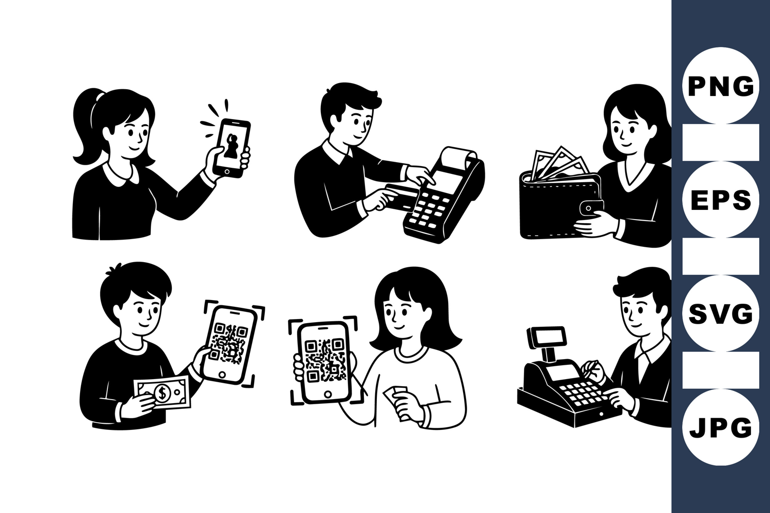 Vector illustrations display various payment methods including qr code scanning, cash handling, and using cash registers in a simple black and white flat design style, showcasing modern financial transactions.