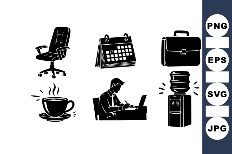 Black silhouette vector icons depict an office worker typing on a laptop surrounded by an office chair, coffee cup, calendar, briefcase, and water cooler, conveying workplace atmosphere and productivity.