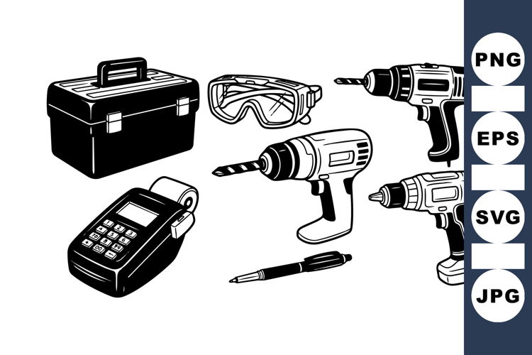 Hand Tool Clipart Toolbox Vector Art Construction Tool Graphics Power Drill Graphic Safety Goggles Illustration Mechanic Repair Design Workshop Equipment Drawing Electric Screwdriver Icon Hardware Maintenance Art Industrial Tool Depiction