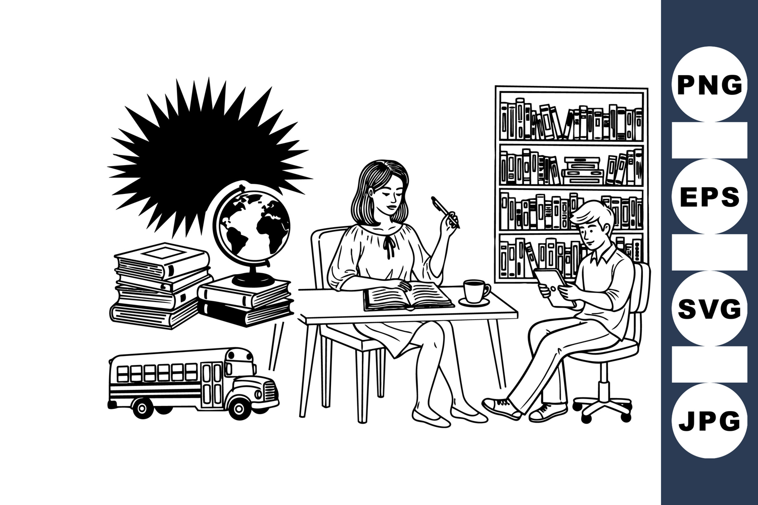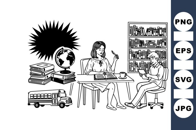 Detailed line art portrays a woman teaching a student in a learning environment with books, a globe, a school bus, and a full bookshelf, emphasizing education and study themes.