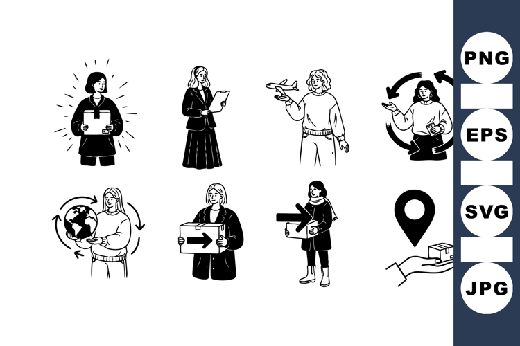 Hand drawn black and white vector illustrations depict diverse women holding packages, globe with arrows, airplane model, and location marker, representing delivery, shipping, and global logistics concepts in a minimalist style.