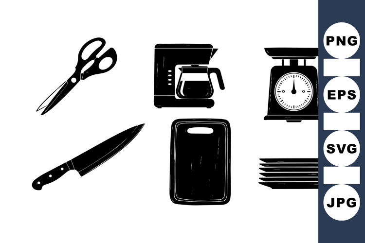 Kitchen Tools Clipart Coffee Maker Design Silhouette Cooking Utensils Black Kitchen Graphics Cutting Board Illustration Kitchen Scale Art Cooking Knife Graphic Stacked Plates Image Scissors Silhouette Art Household Kitchen Icons