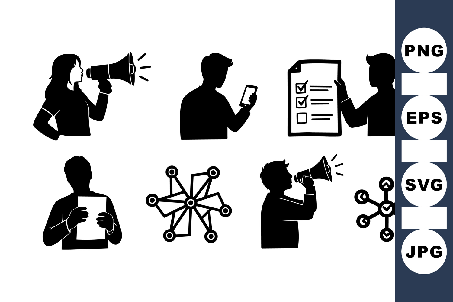 Black and white vector silhouettes depict individuals with megaphones, checklists, and smartphones representing communication, management, and teamwork in minimalist flat style for business visuals.