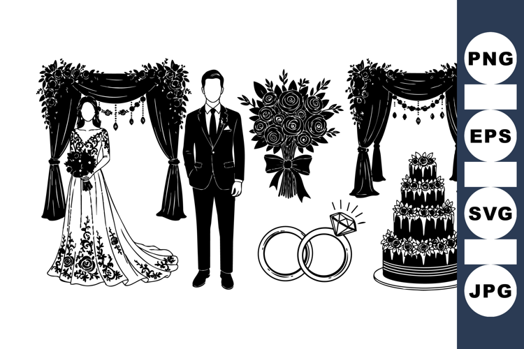 Wedding Silhouette Clipart Bridal Bouquet Design Floral Arch Decoration Groom Suit Illustration Wedding Rings Graphic Wedding Cake Drawing Romantic Ceremony Art Bridal Dress Clipart Elegant Wedding Icons Marriage Celebration Art