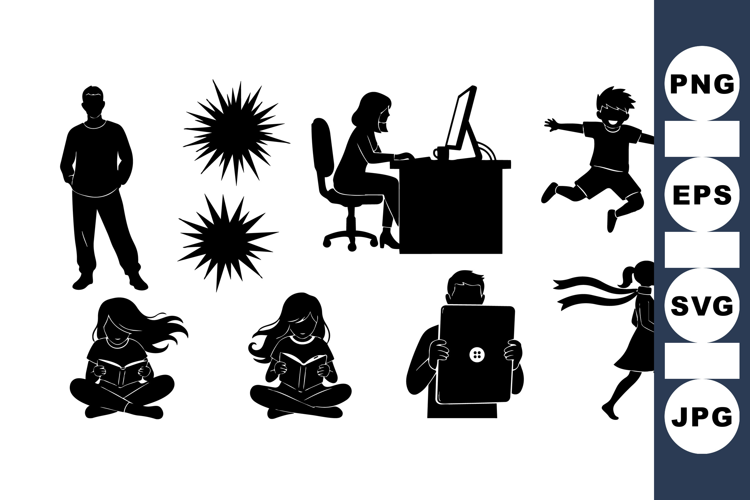Office Worker Clipart Woman Reading Illustration Silhouette People Clipart Vector Human Figures Children Playing Art Boy Jumping Vector Girl Walking Clipart Digital Silhouette Graphics Black Shadow People Casual Figure Design