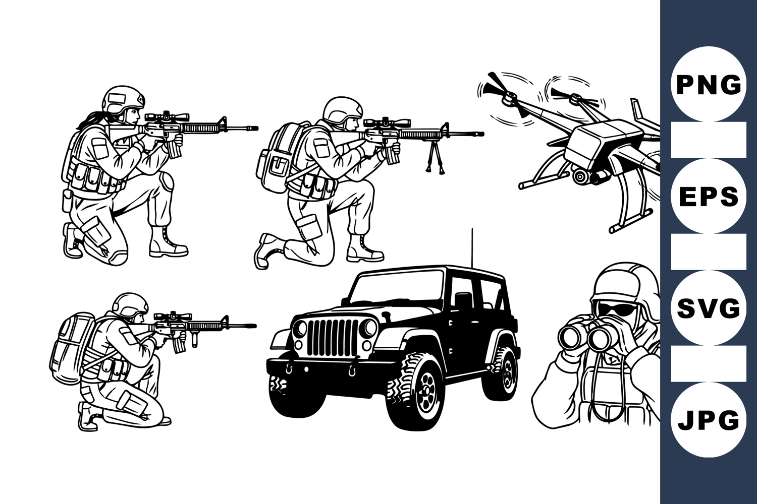 Military Tactical Vector Soldier Weapon Clipart Combat Vehicle Illustration Armed Forces Design Tactical Gear Graphic Military Drone Sketch Sniper Rifle Artwork Military Binocular Art Soldier Silhouette Image