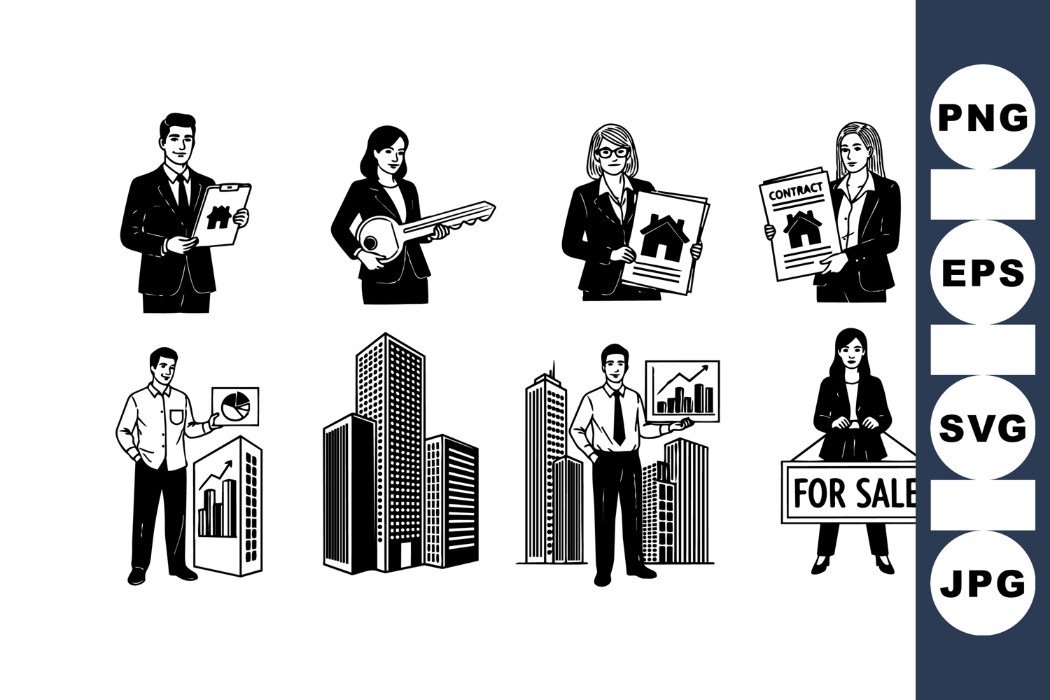 Monochrome vector illustration depicts real estate agents presenting keys, contracts, and sales signs with modern cityscape and graph charts, illustrating property market and business environment in a clean, professional style.