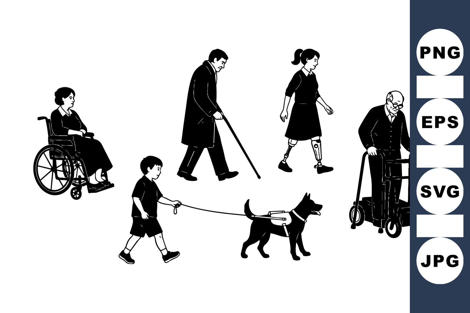 Prosthetic Leg Vector Disability Silhouette Clipart Wheelchair User Graphic Guide Dog Illustration Walking Cane Icon Elderly Assistance Art Mobility Aid Design Disability Support Image Inclusive Design Art