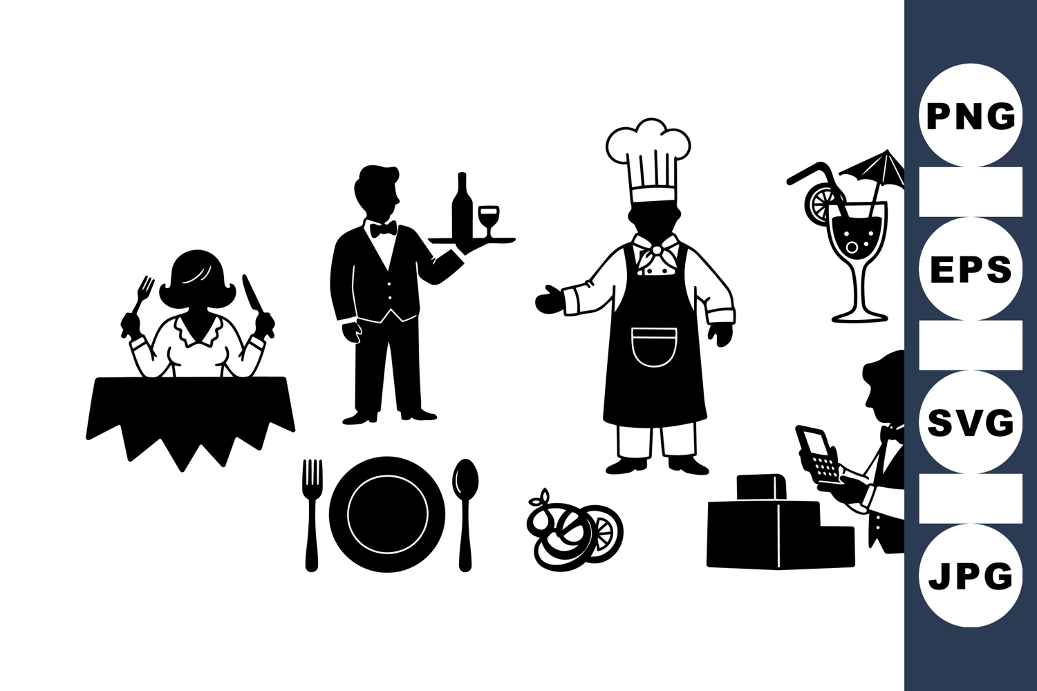 Black silhouettes depict various restaurant roles: a woman ready to eat, a waiter carrying wine, a chef presenting dishes, a cocktail with umbrella, and a cashier using calculator, exhibiting hospitality atmosphere.