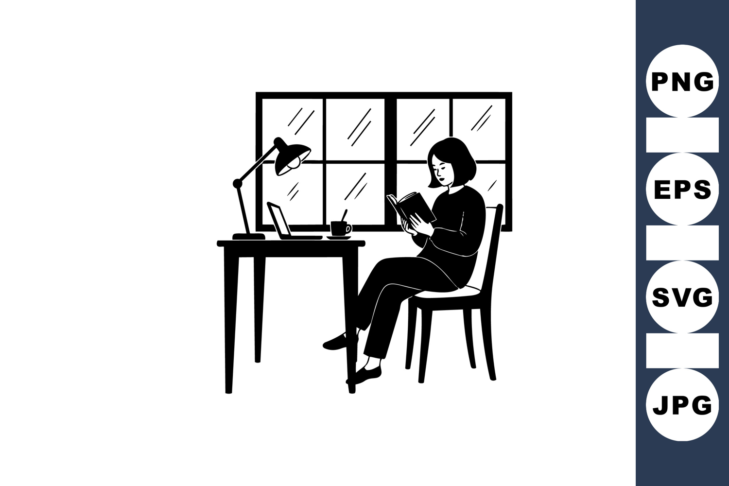 A monochrome vector illustration shows a woman sitting and reading a book at a desk with a laptop, cup, and desk lamp, positioned in front of a large window, conveying focus and calm indoor mood.