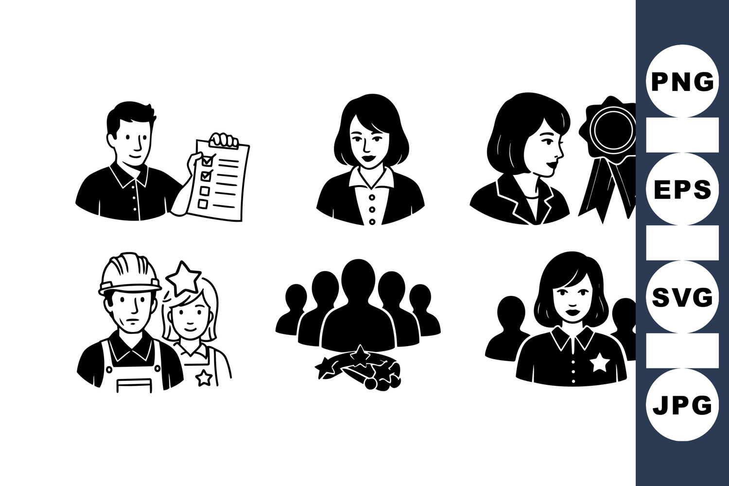 Simple black and white minimalist vector icons display various professional and team concepts including checklist, worker with star, award, and group silhouettes in clean style.