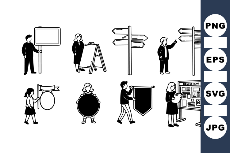 A series of minimalist black and white vector illustrations depict men and women holding different types of signs and directing attention to signposts, presenting a clean and simple visual style suitable for instructional or informational use in digital and print media.