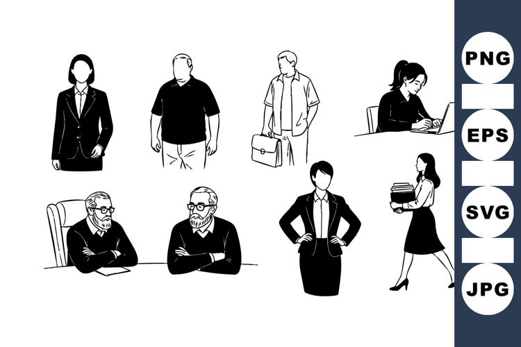 Minimalist black and white vector art depicts diverse business people performing office tasks like typing on laptop, carrying briefcase, walking with documents, and sitting thoughtfully, conveying professional atmosphere.
