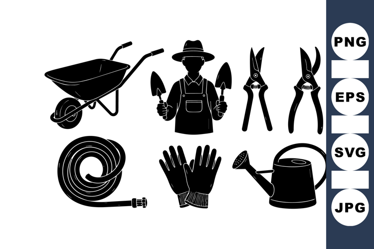 Garden Tools Clipart Watering Can Illustration Wheelbarrow Silhouette Garden Hose Graphic Yard Work Graphics Pruning Shears Design Gardening Vector Icons Garden Gloves Artwork Gardener Tool Images Planting Tools Design