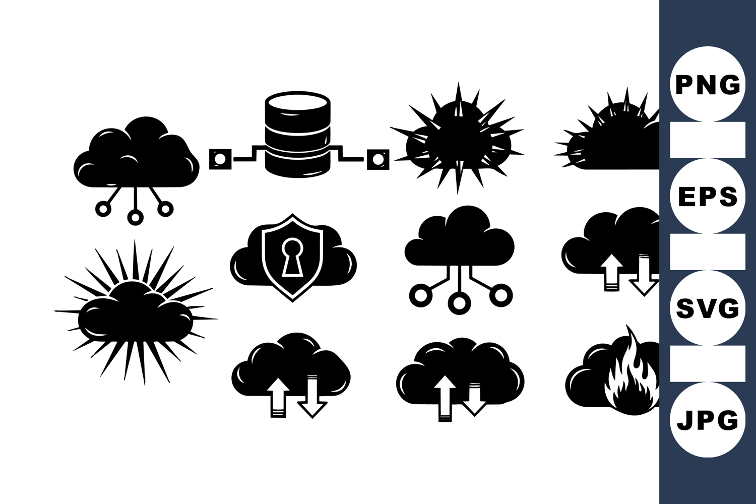 A collection of black cloud computing icons features data storage, upload and download arrows, firewall and security shield symbols in flat vector style for tech and software projects.