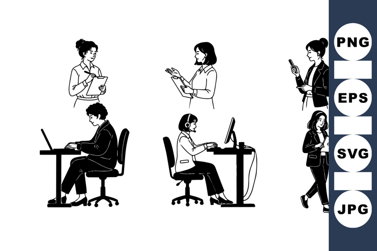 Business Woman Illustration Professional Office Clipart Office Team Graphics Office Worker Drawing Working At Computer Woman Using Laptop Female Office Staff Headset Office Employee Business Person Sketch Woman Holding Clipboard