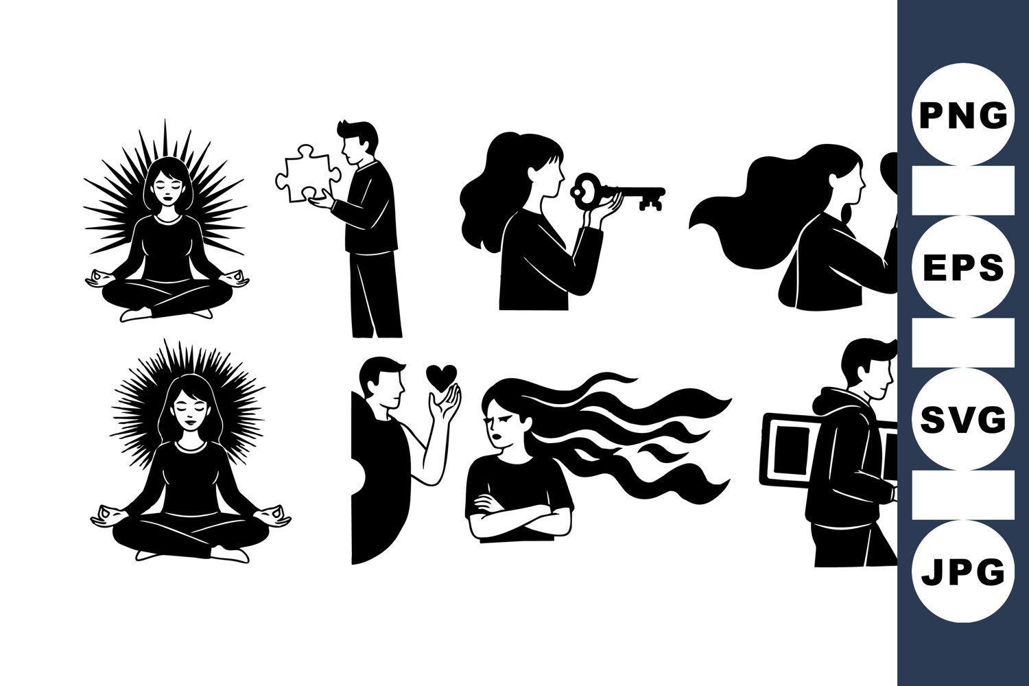 Silhouetted figures in black and white display meditation poses, puzzle solving, and symbolic interactions including love and unlocking concepts in minimalistic vector style, offering calm and thoughtful mood.