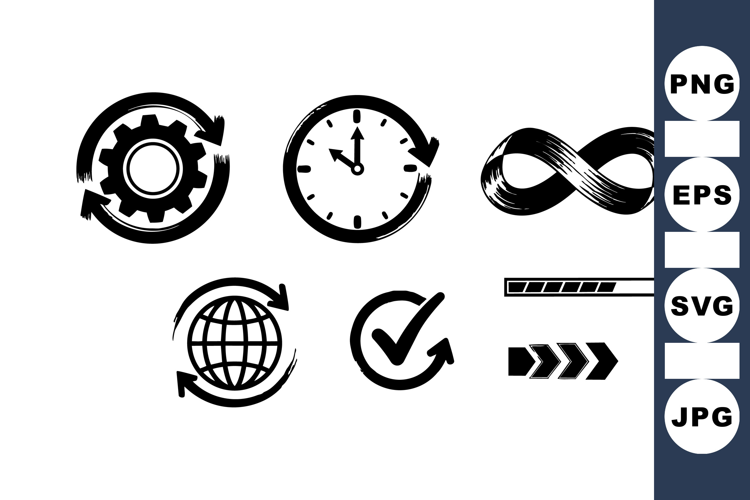 Hand painted brush stroke icon depicts refresh gear, clock, infinity, globe, check, progress and chevrons, intended for web, app, and editorial use; bold, gritty.