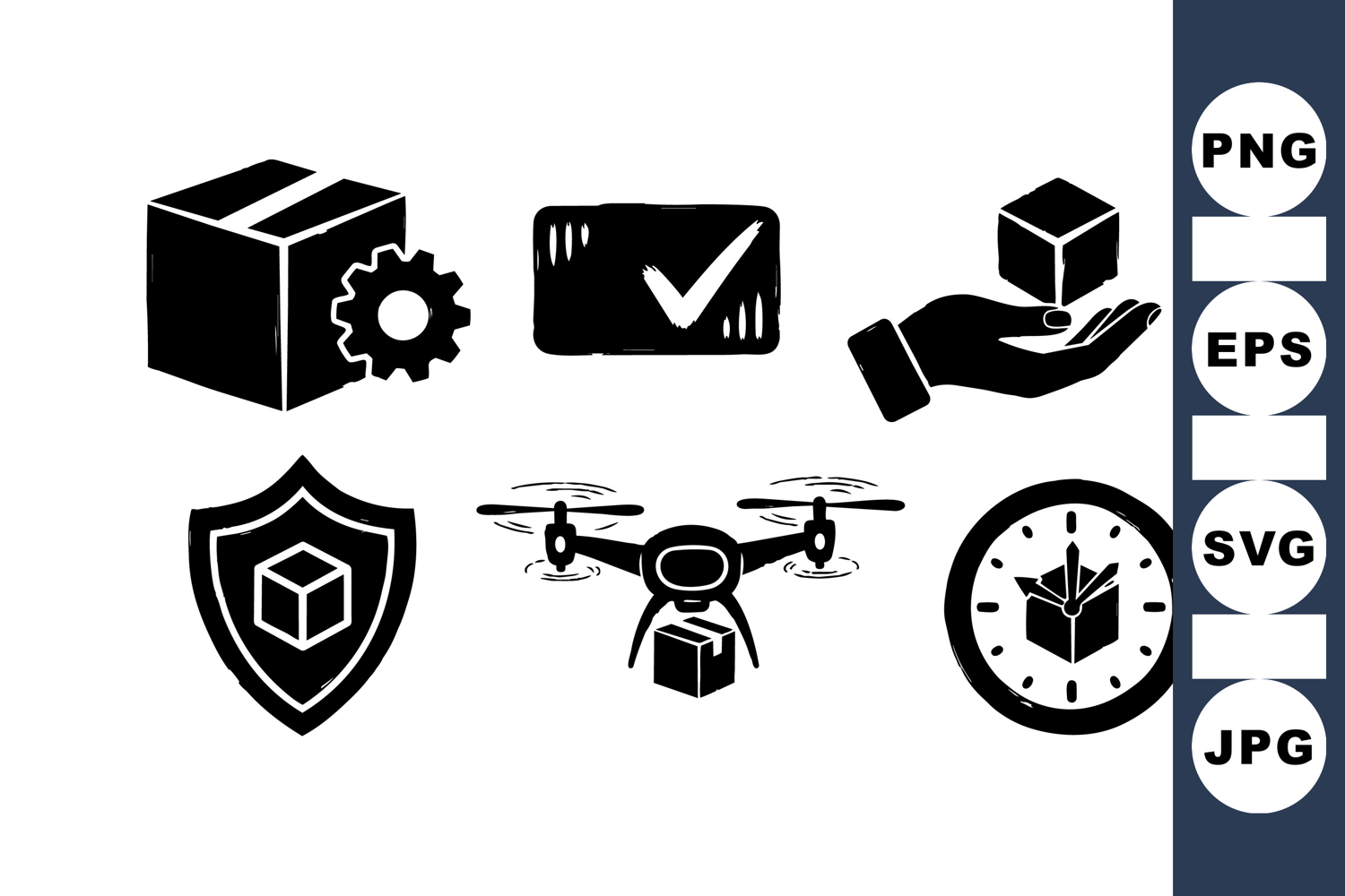 Bold black silhouette icons illustrate key elements of package delivery including drone shipment, secure packaging, quality assurance, and punctual timing in a vector style design.