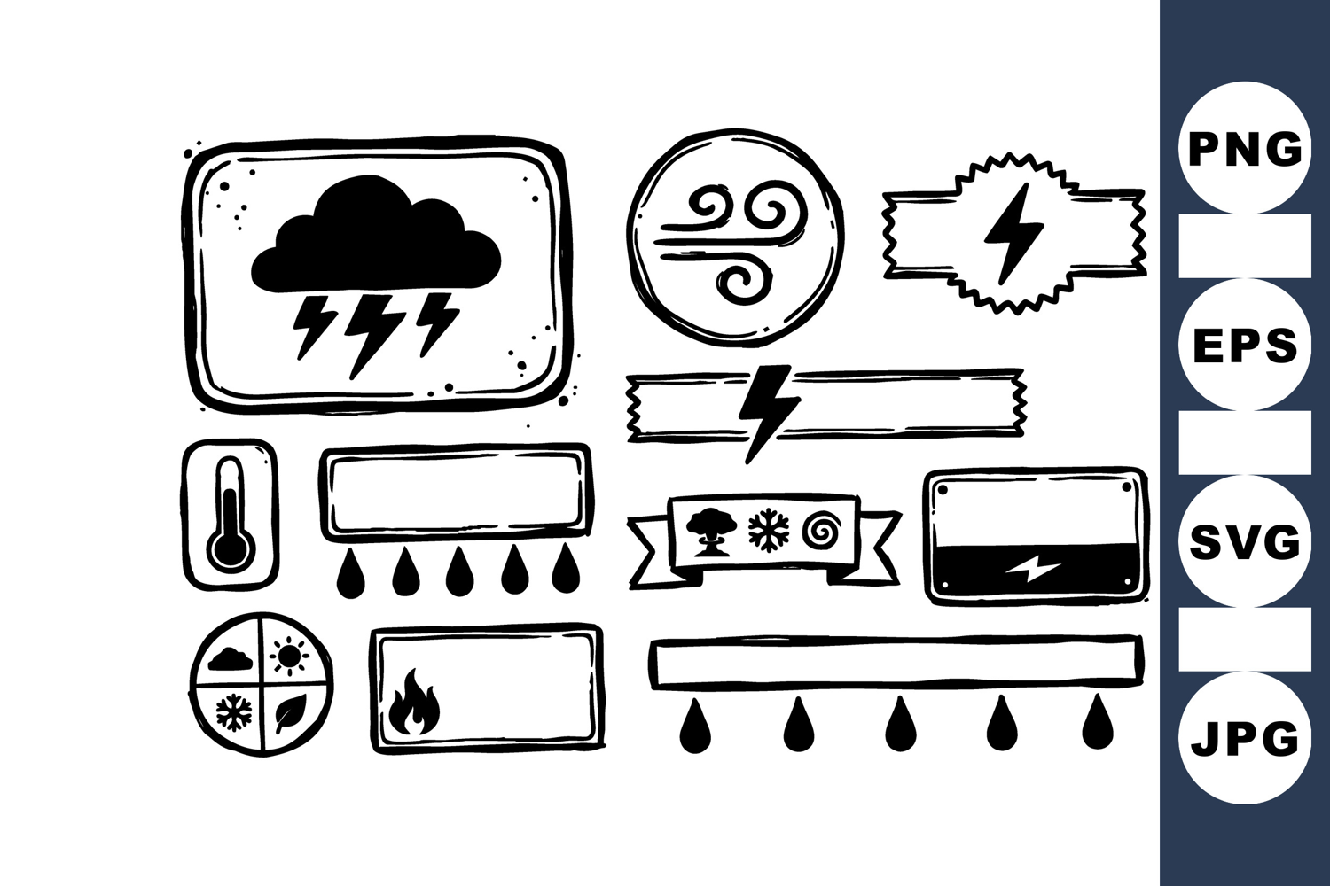 Hand Drawn Icons Black Outline Icons Natural Elements Design Rain And Wind Icons Weather Icon Design Storm Lightning Symbol Vector Weather Illustration Weather Forecast Graphics Climate Symbol Artwork Weather Badge Clipart