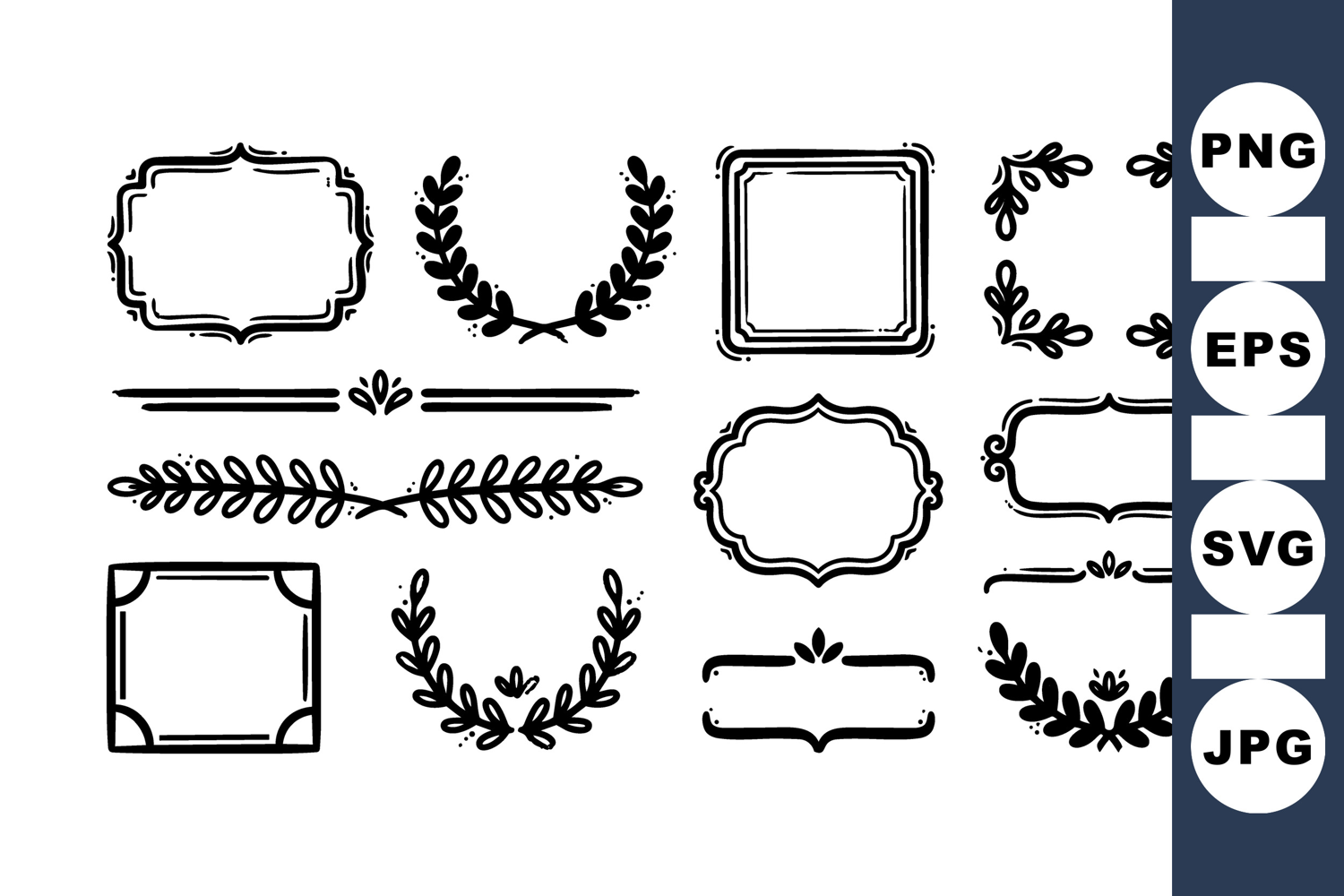 Collection of black hand drawn decorative frames and leaf wreath borders in vintage style, suitable for invitations, stationery design, and elegant branding projects. classic and artistic.