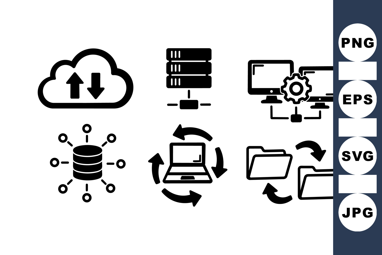 of flat design network and data icons featuring cloud upload and download, server storage, laptop sync, and folder sharing symbols presented in black minimalist silhouettes suitable for digital projects.