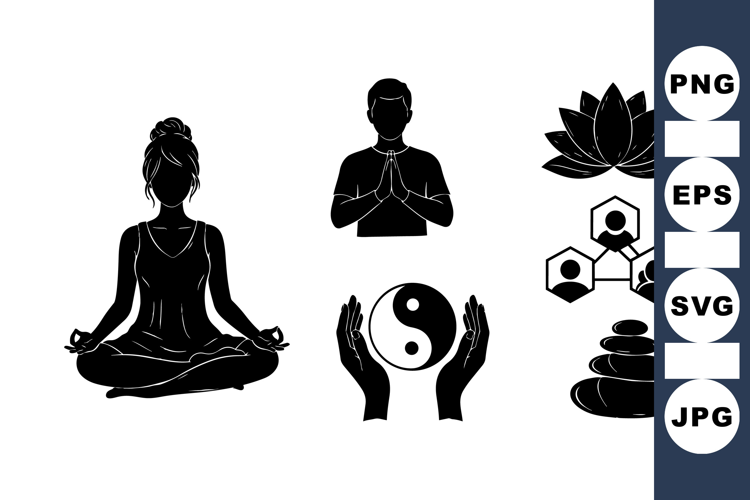 Spiritual Wellness Icons Yoga Pose Graphics Zen Lotus Illustration Meditation Icon Vector Prayer Hands Design Balance Stone Clipart Mindfulness Silhouette Art Calming Meditation Imagery Zen Harmony Symbols Relaxation Posture Graphics