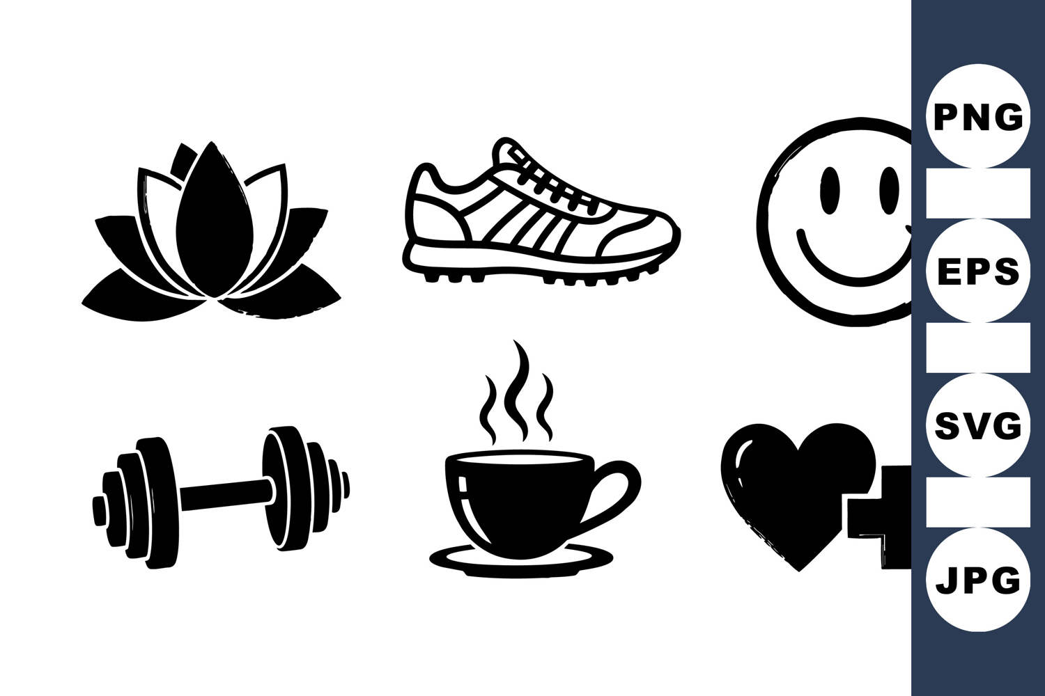 A collection of black silhouette icons includes lotus flower, dumbbell, sports shoe, smiling face, steaming coffee cup, and heart with health cross, illustrating wellness and lifestyle essentials.
