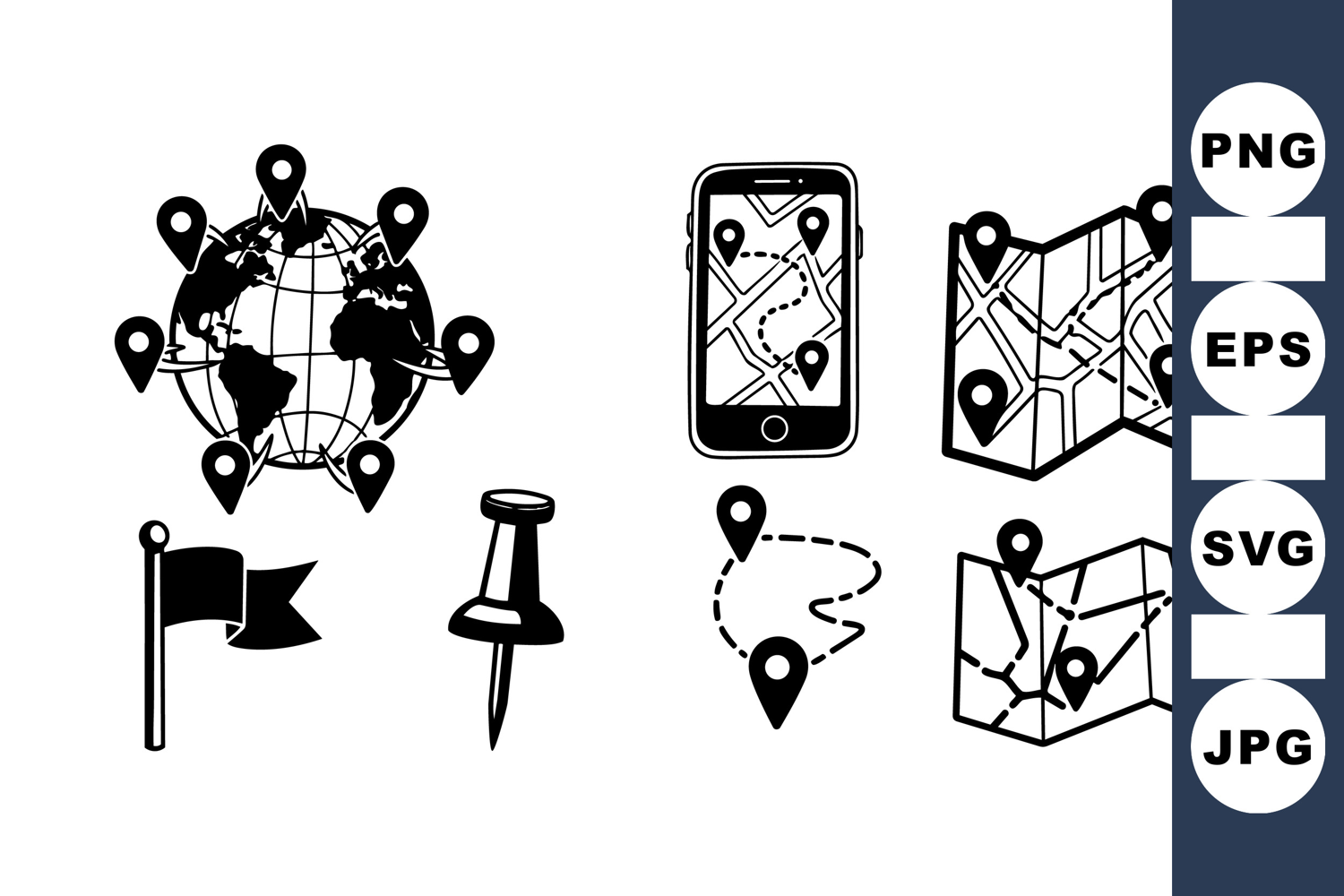 of black and white vector icons depicting location pins on a globe, smartphone map, unfolded maps, and directional flags, illustrating navigation and geographic positioning in a minimalist style.