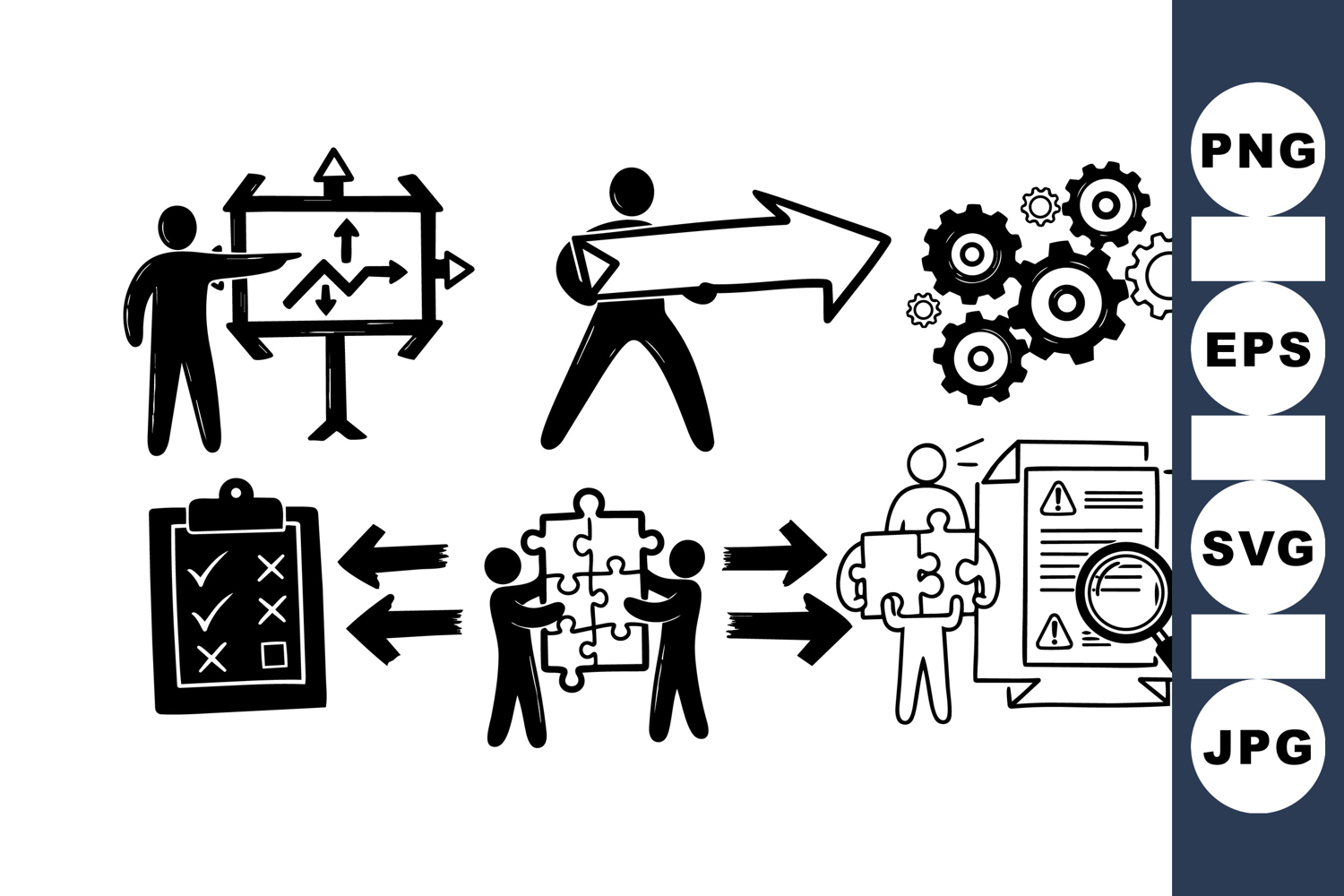 A collection of black and white business themed icons depicting a person presenting charts, holding a large arrow, gear mechanisms, checklist, puzzle teamwork, and document analysis, designed in simple flat vector style for corporate presentations and infographics.