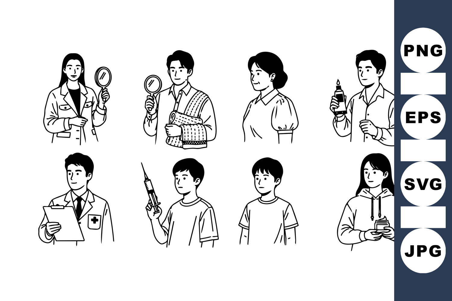 A black and white minimal line art collection illustrating diverse individuals with magnifying glasses, documents, syringes, and candles in simple poses and clean outlines for versatile design use.