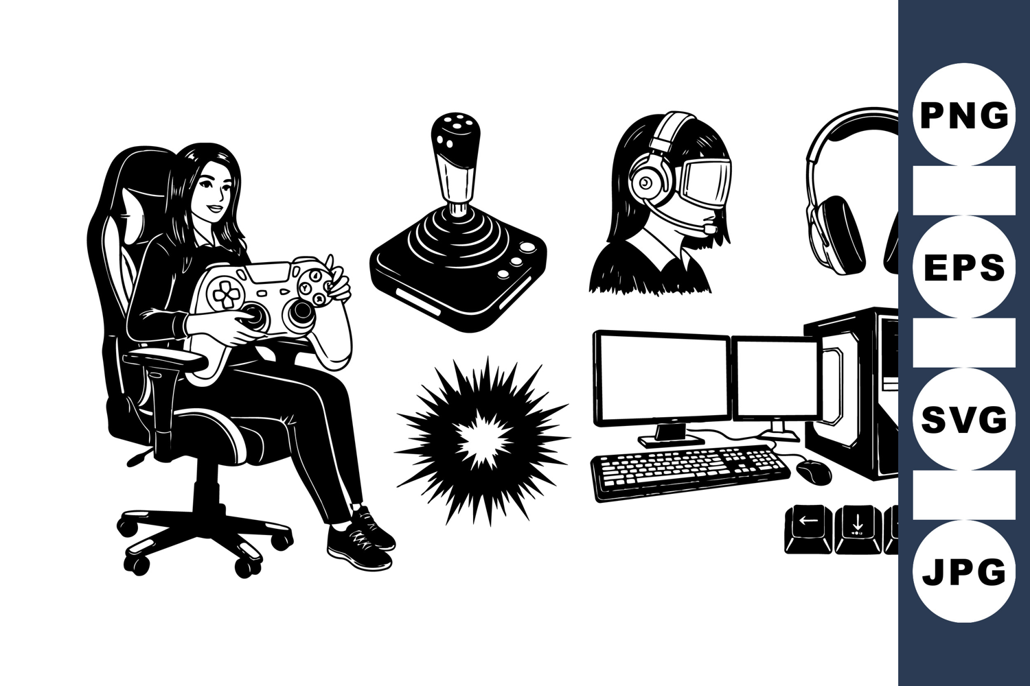 A monochrome vector illustration showing a female gamer with a gamepad seated in a gaming chair. includes joystick, headset, dual monitors, desktop pc, keyboard, and explosive graphic accents. minimalist style.