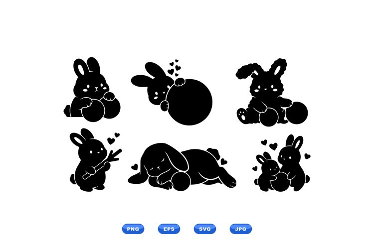 A of flat kawaii bunny silhouettes shows playful poses holding balls cuddling and sleeping with heart accents suitable for stickers greeting cards and apparel cheerful