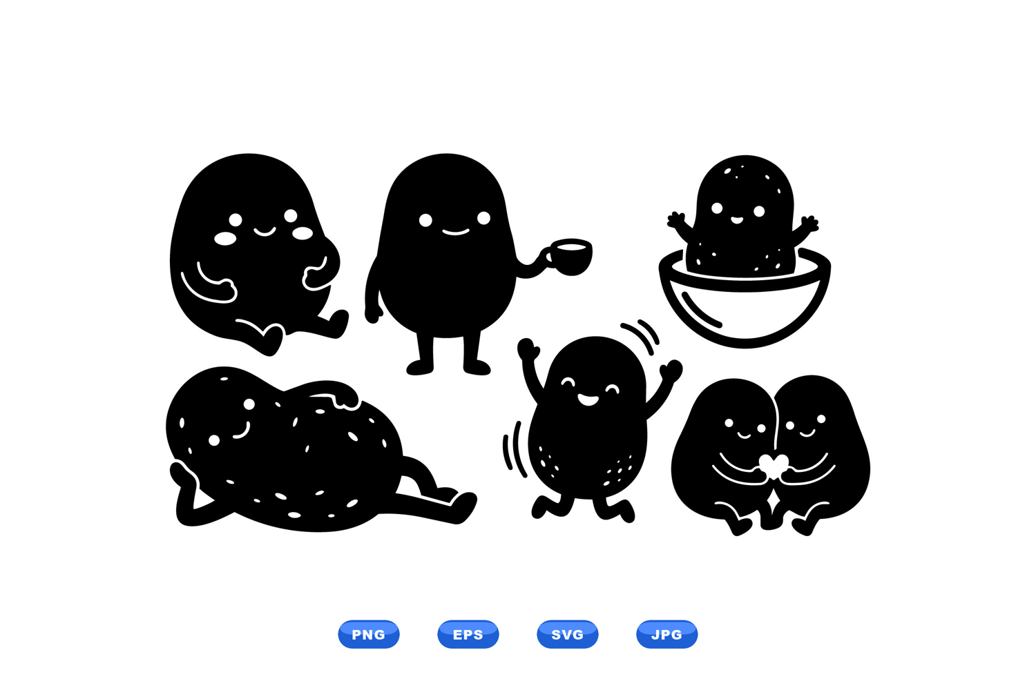 A flat design vector shows cute potato characters in black silhouettes used for stickers apparel prints childrens books and playful branding