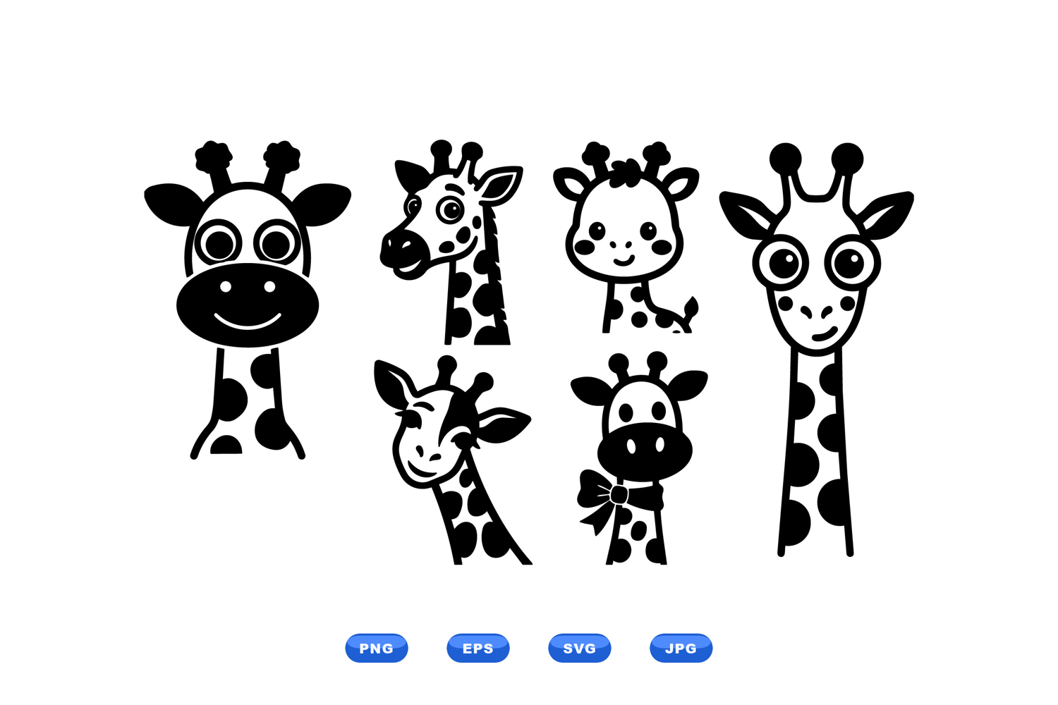 Playful flat vector displays six black giraffe head icons in bold line art style ideal for logos stickers children products and playful branding