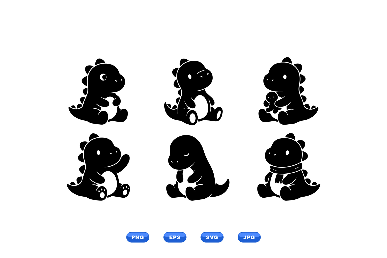 A flat design vector shows six playful baby dinosaur silhouettes in varied poses including holding a toy and wearing a scarf used for kids branding or apparel fun.