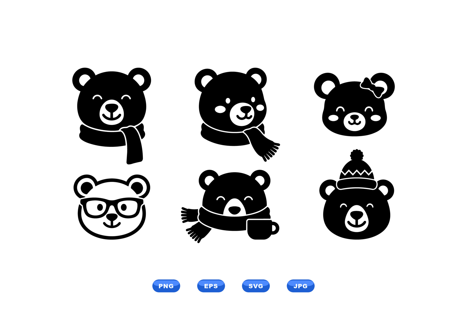 A monochrome flat vector shows six cute bear head icons with scarves hats bow and glasses some holding a mug for icons stickers and branding playful