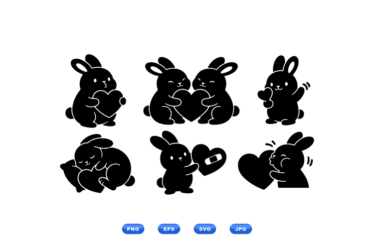A minimalist vector icon shows six playful black bunny characters holding hearts in various poses for stickers branding social media valentine designs charming