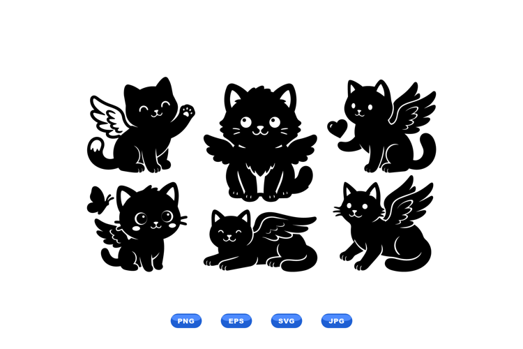 A playful vector shows six winged cat silhouettes in flat design ideal for stickers apparel and social media graphics whimsical
