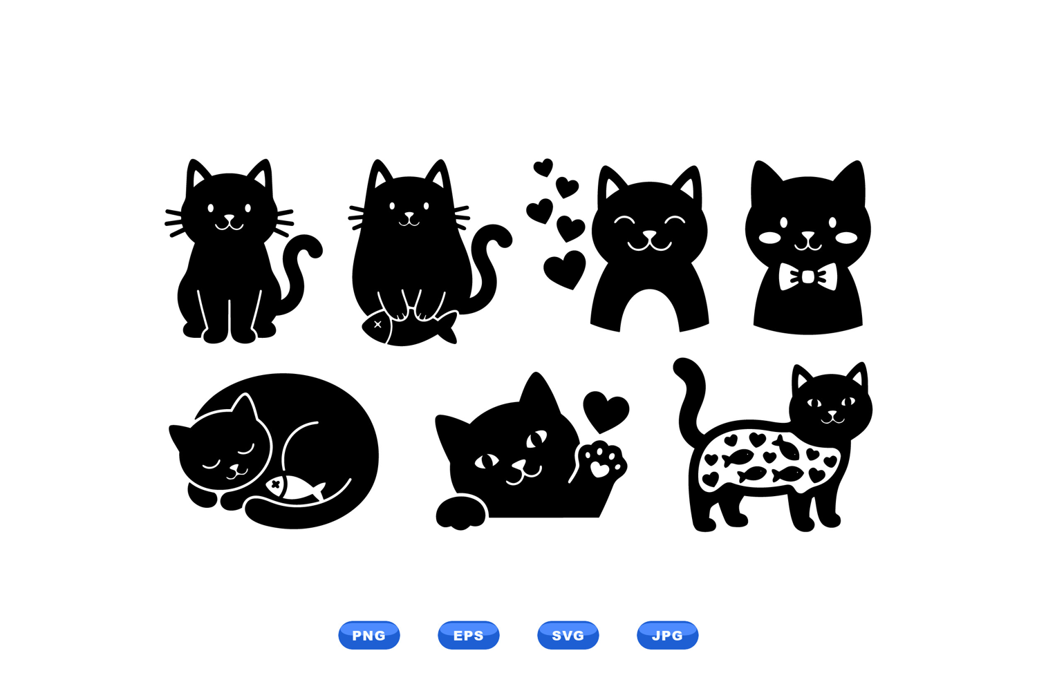A flat vector icon depicts playful cat silhouettes in varied poses including sitting sleeping waving and holding fish used for stickers web icons and branding playful